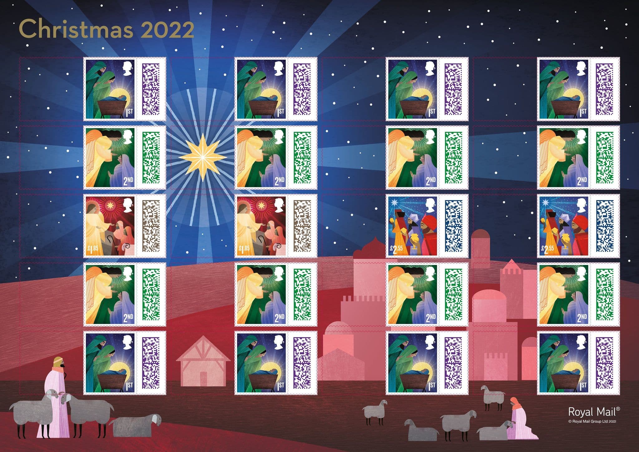For Christmas 2022, Royal Mail has released a series of six stamps, exclusively illustrated by artist Katie Ponder. 'The six designs reflect Katie Ponder’s unique style, providing a fresh and contemporary feel but with references to art deco which add a timeless quality to the classic nativity story.